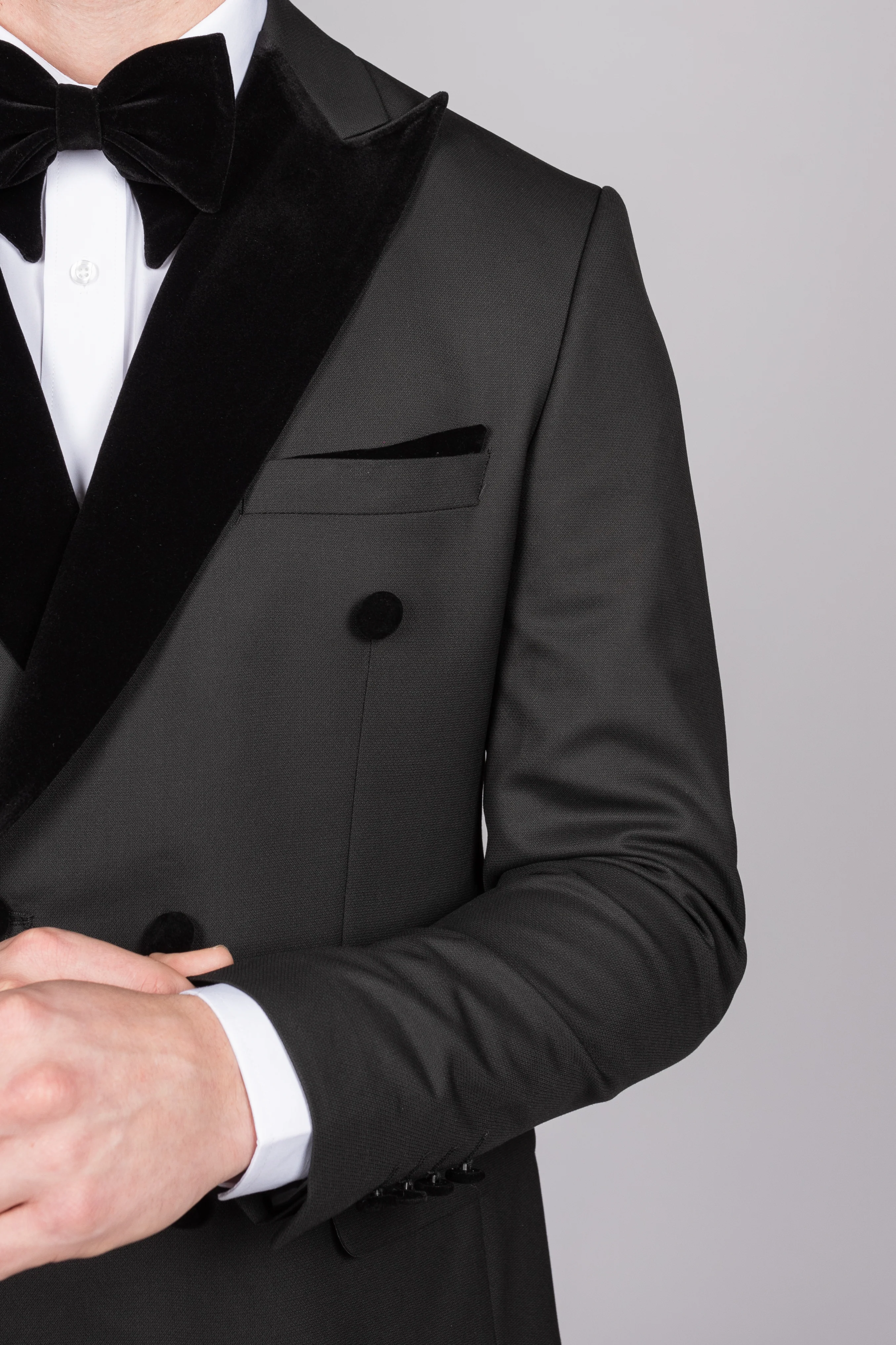 The Black Double Breasted Velvet Peak Lapel Tux by Suit Sartoria is a must-have addition to the modern man's wardrobe. Tailored to a slim fit, this suit is the perfect choice for a black tie or formal event. The deep black colour adds a unique touch of sophistication, making it ideal for both the office and special occasions. This suit’s timeless double-breasted design, combined with its contemporary cut, ensures you make a statement of refined elegance.