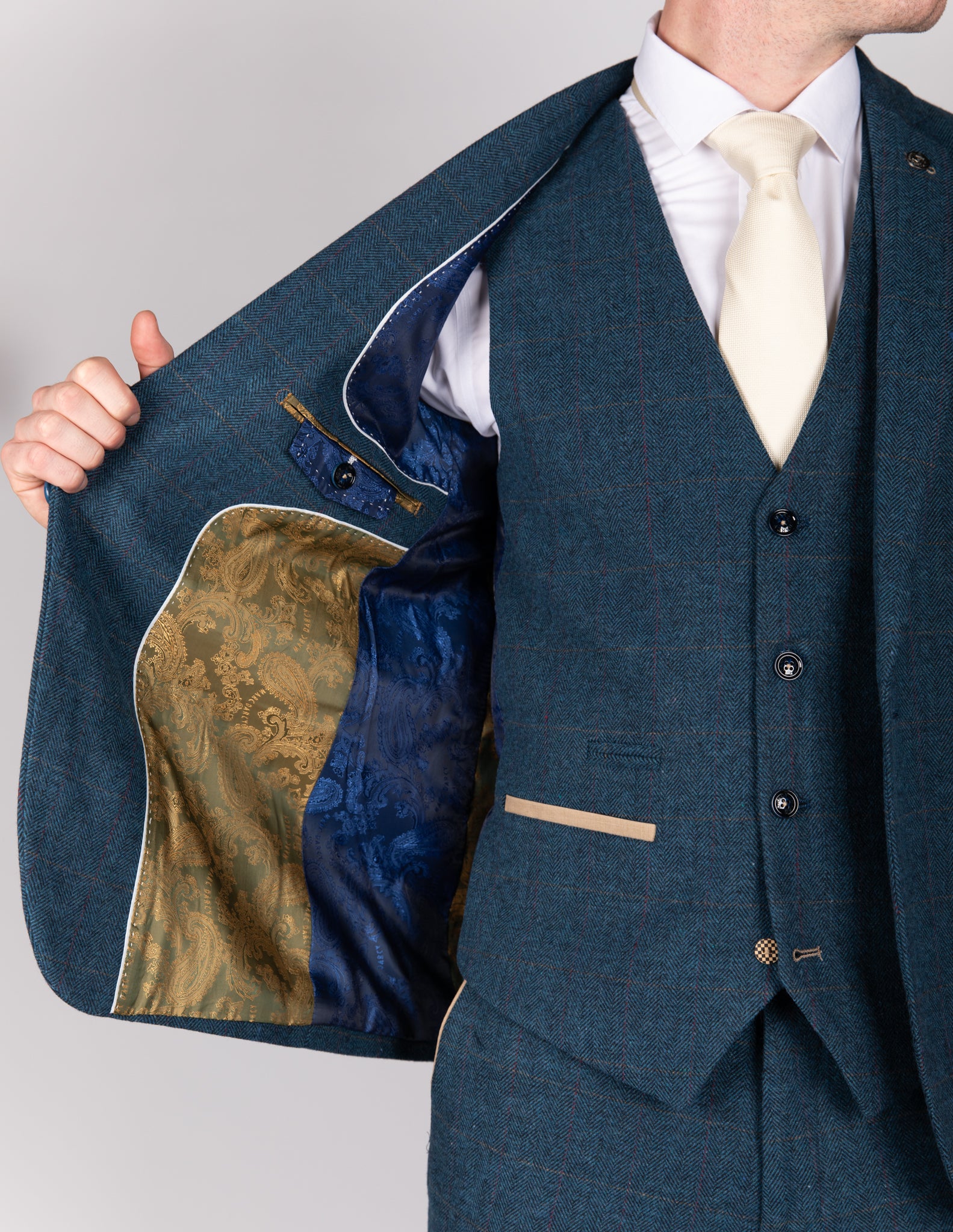 Whether you’re walking down the aisle or attending a formal event, the Dion Blue Tweed Check Three Piece Suit ensures that all eyes will be on you.