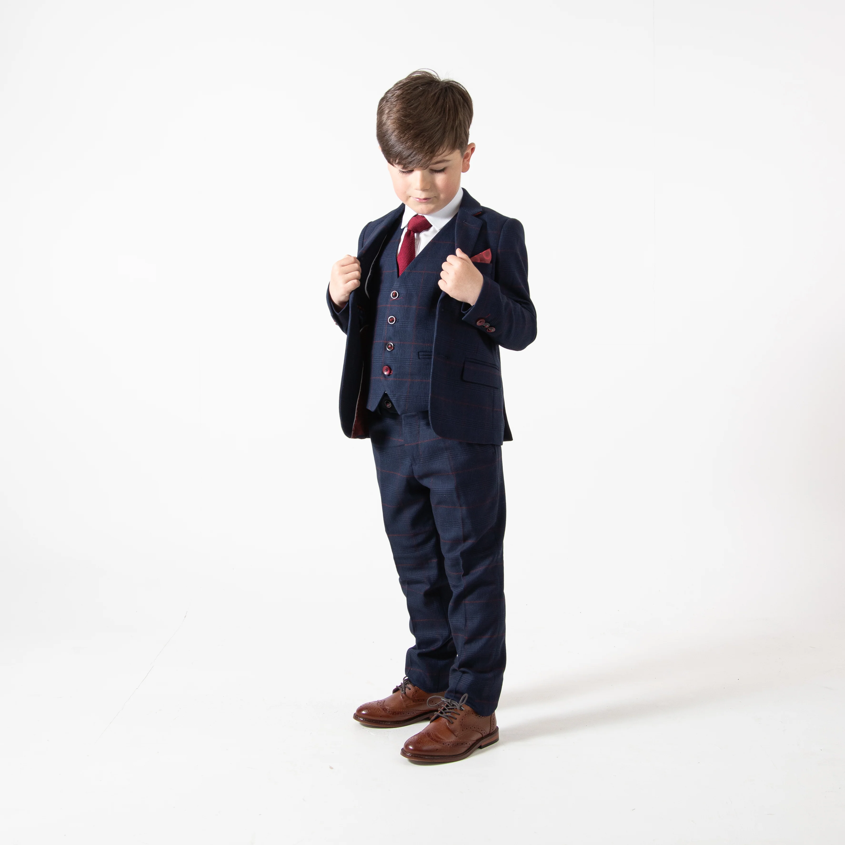 Introducing the Edinson Children's Navy Wine Check Three Piece Suit by Marc Darcy. This stylish ensemble features a classic navy base with a striking wine check pattern, perfect for young fashionistas.