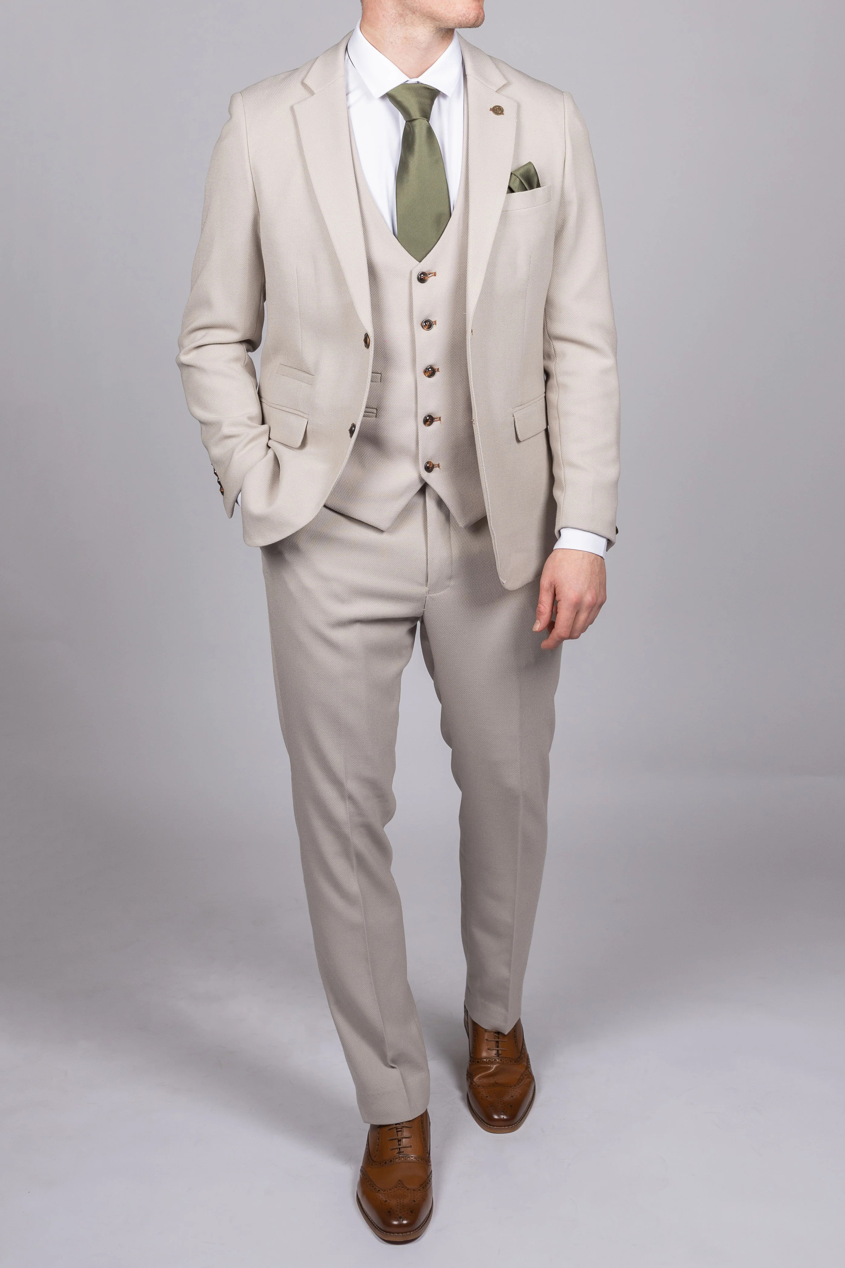 HM5 Stone Tailored Three-Piece Suit by Marc Darcy. This exquisite ensemble, designed exclusively for Manchester United & England footballer Harry Maguire wedding suit, exudes timeless elegance in a neutral stone colour.