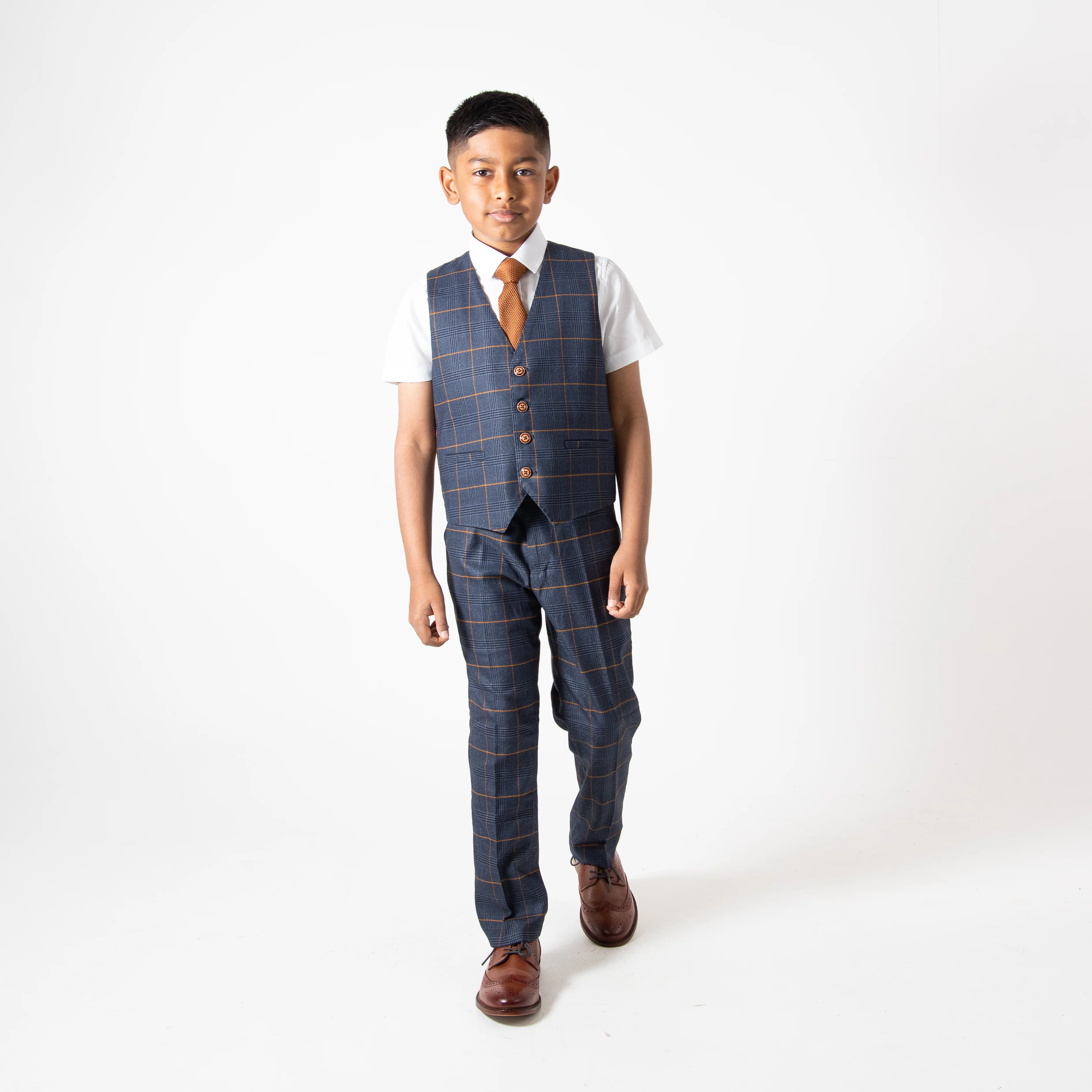 Introducing the Jenson Children's Marine Navy Three Piece Suit by Marc Darcy. This sophisticated ensemble combines a timeless navy and burnt orange check pattern with contemporary style. Designed with your little one in mind, the adjustable waistband offers comfort without compromising on looks.