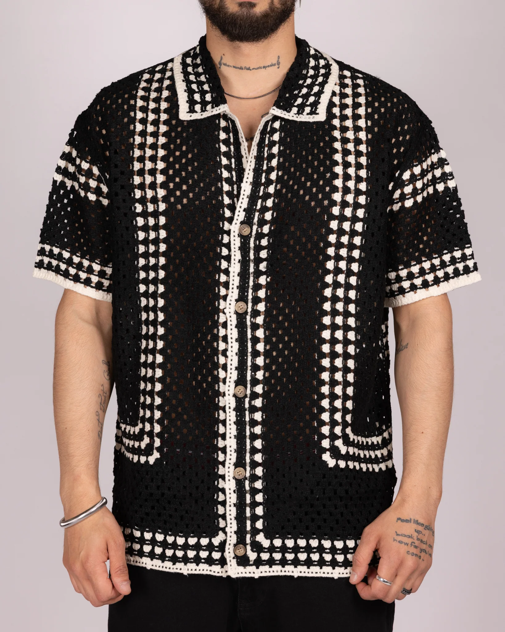 Open-Knit Crochet Shirt with White Geometric Pattern