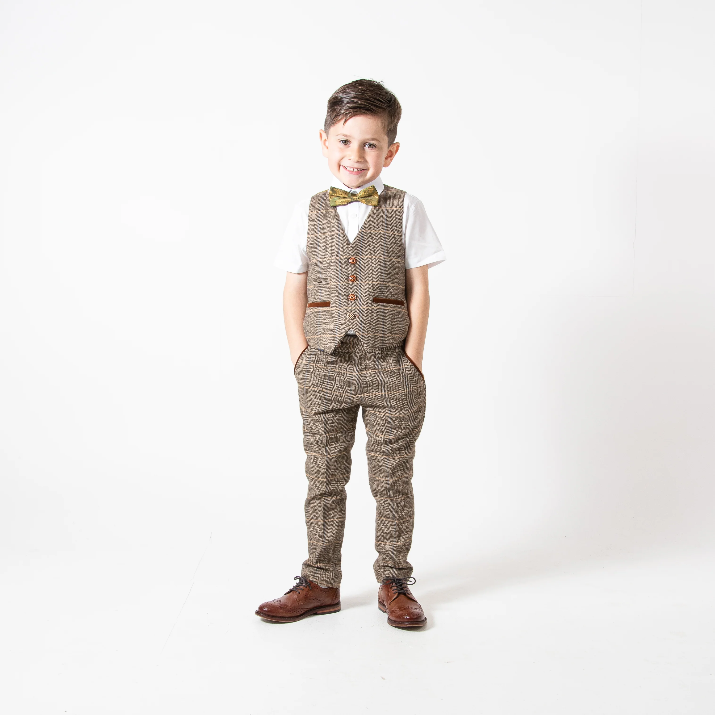 The Ted Tan Children's Tweed Check Three Piece Suit by Marc Darcy brings a touch of vintage elegance to youthful style, inspired by classic country tweeds of yesteryears.